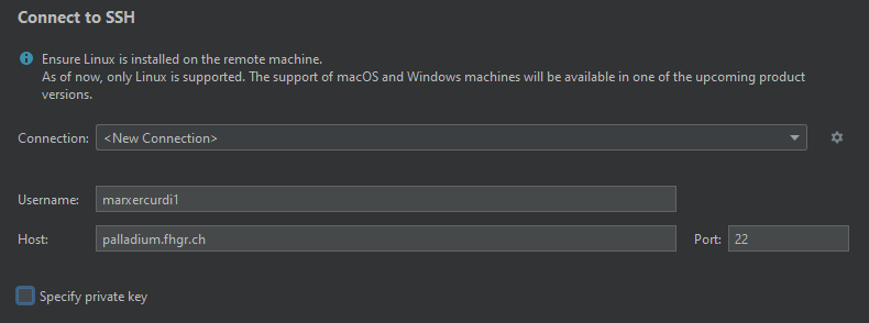 In diesem Menu können wir beim Punkt SSH Connection die Option "New Connection" auswählen und eine Workstation wie zum Beispiel Palladium palladium.fhgr.ch mit dem eigenen Benutzernamen hinzufügen: